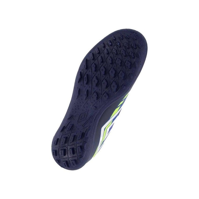 Já o solado é específico para quadras de grama sintética com travas baixinhas para maior durabilidade e firmeza.