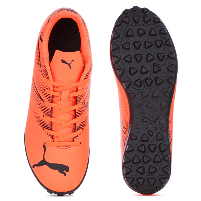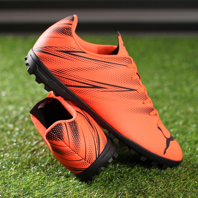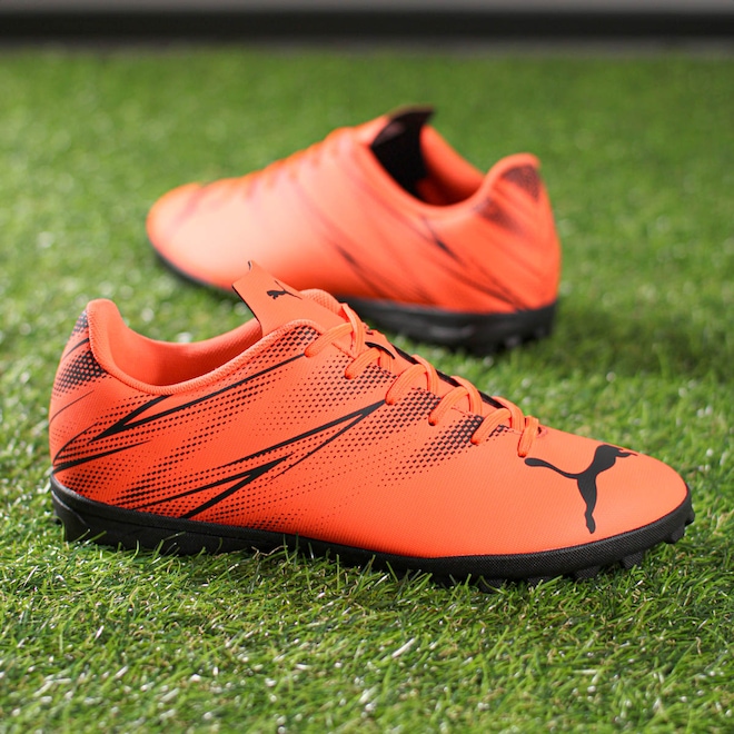 Domine os gramados sintéticos com conforto e precisão! Chuteira Puma Society Attacanto TT BDP Preto e Laranja - Masculino Ficha Técnica: Marca: Puma Modelo: Attacanto TT BDP Indicação: Society Gênero: Masculino Cabedal: Material sintético reforçado Palmilha: EVA, removível para fácil higienização Forro: Revestimento têxtil com acolchoamento no calcanhar Solado: Borracha com micro travas fixas Fechamento: Cadarço Lingueta: Fina e flexível Cor: Preto e Laranja Detalhes: Símbolo da Puma na biqueira, laterais e lingueta Já sofreu com chuteiras que escorregam ou causam desconforto durante o jogo? A Puma Attacanto TT BDP chegou para mudar isso! Por que investir? Seu cabedal sintético reforçado proporciona maior durabilidade e ajuste ao pé, enquanto o solado de micro travas fixa você no chão com segurança, garantindo controle e tração em cada jogada. Além disso, o forro acolchoado oferece mais conforto e a palmilha removível facilita a higienização. Eleve seu jogo e jogue sem preocupações! Conteúdo da embalagem: 1 par de Chuteira Puma Society Attacanto TT BDP Preto e Laranja - Masculino