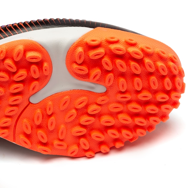 O solado em emborrachado com travas baixas e fixas oferece tração excepcional, permitindo movimentos ágeis em campo.