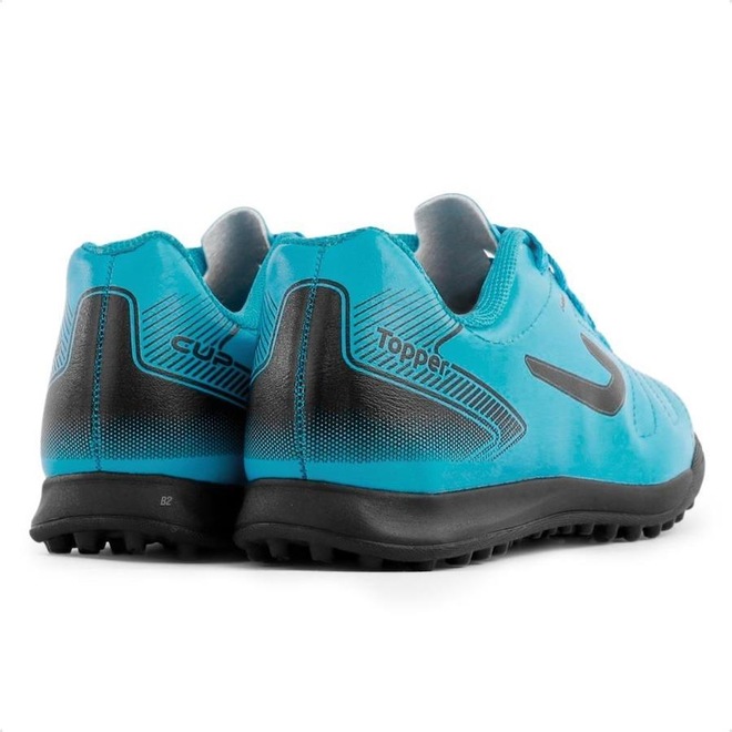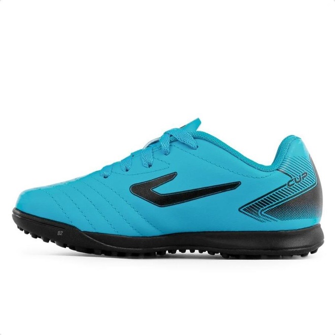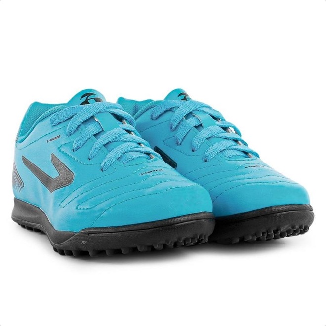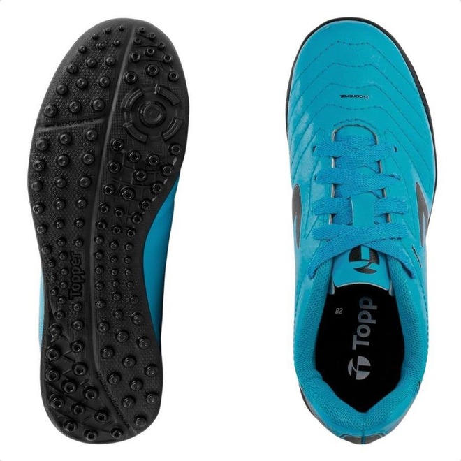 O cabedal em sintético possui acabamento levemente texturizado que garante um toque macio na bola, já o solado de borracha assegura estabilidade nas quadras de society.