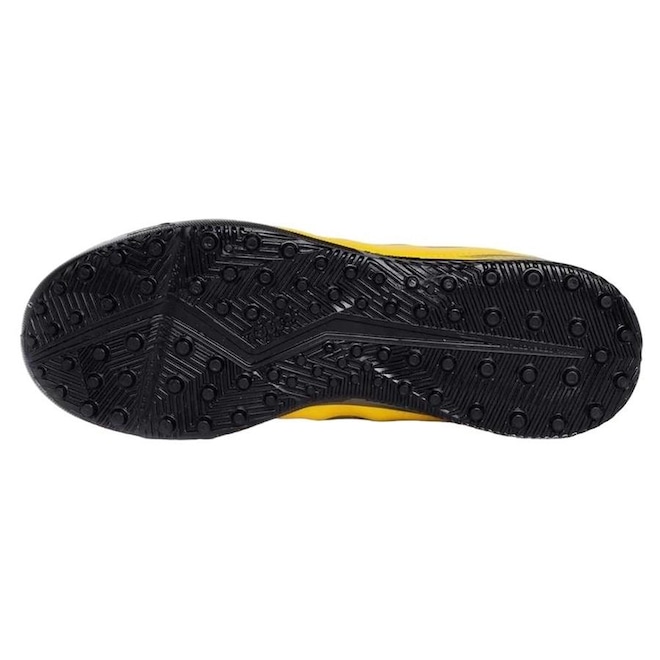 O solado da chuteira é de borracha equipado com micro travas estrategicamente posicionadas, que oferecem excelente tração e aderência em campos de grama sintética, permitindo movimentos rápidos e precisos.