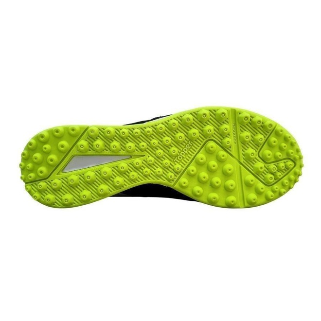 Solado com travas baixas que proporcionam tração e aderência em campos de grama sintética.