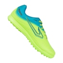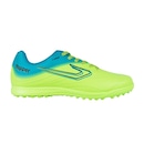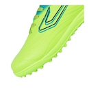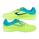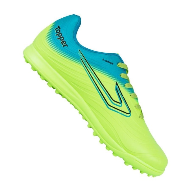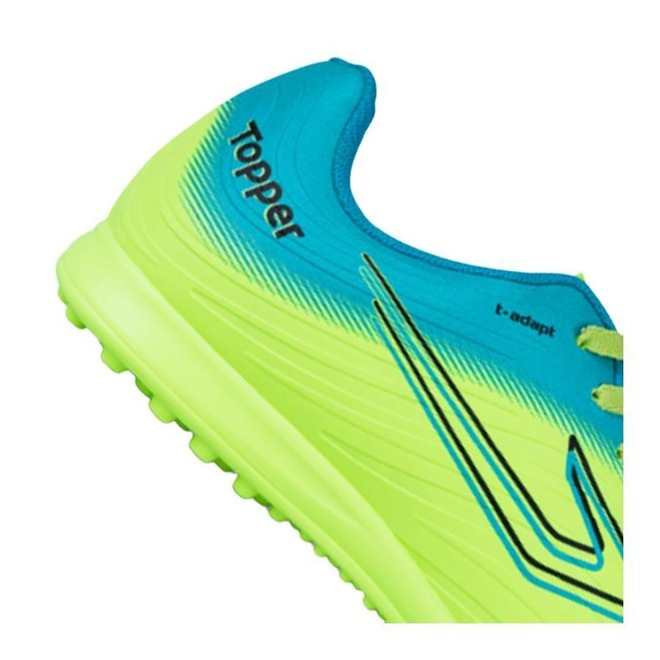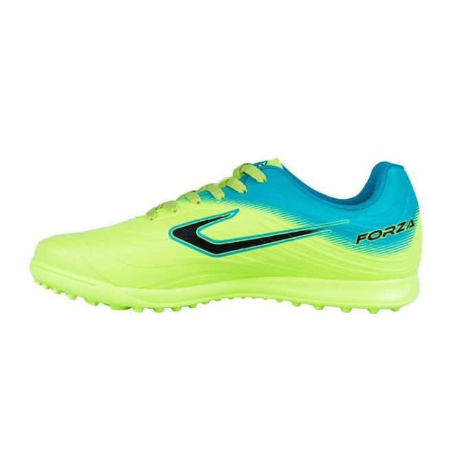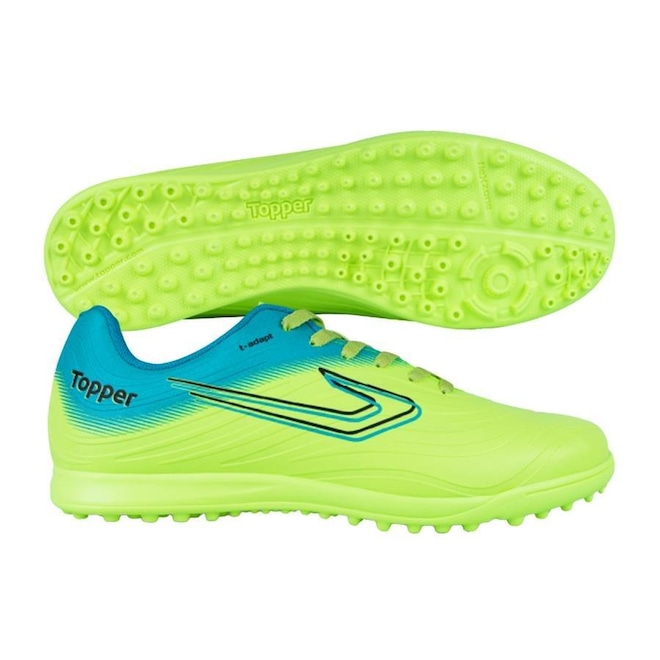 Solado: Borracha com travas fixas para excelente aderência e estabilidade em campos de grama sintética.