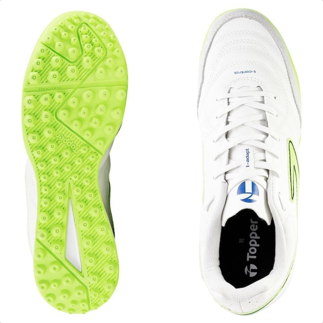 O logo Topper vem costurado nas laterais, com texturas que aumentam o controle de bola.