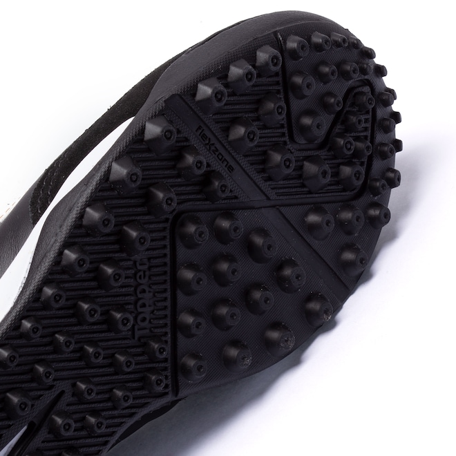A chuteira Topper oferece cabedal (parte superior do calçado) em materiais de alta qualidade, proporcionando suporte e apoio.