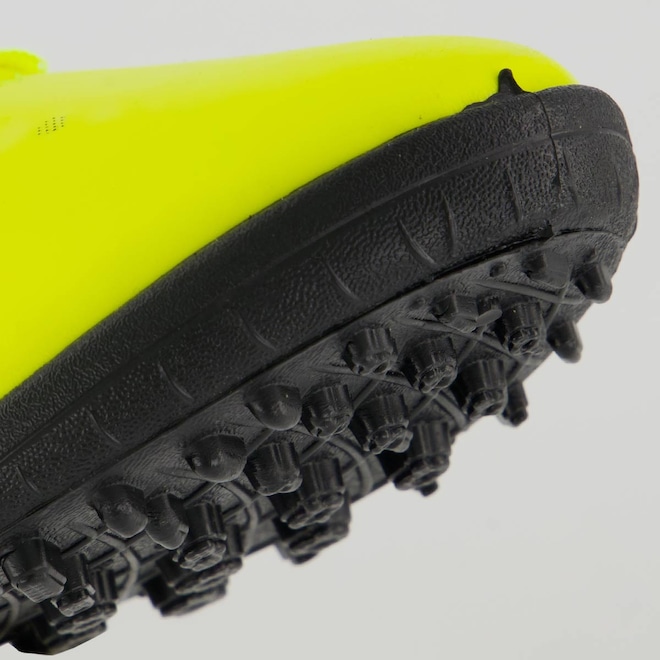 Com cabedal sintético resistente, ela proporciona toque de bola preciso e ótimo ajuste ao pé. O solado emborrachado com travas baixas garante aderência nas quadras de grama sintética, permitindo movimentos rápidos e seguros. A palmilha forrada e o reforço acolchoado no calcanhar oferecem conforto extra para jogar por horas, sem abrir mão da proteção.