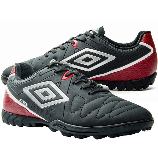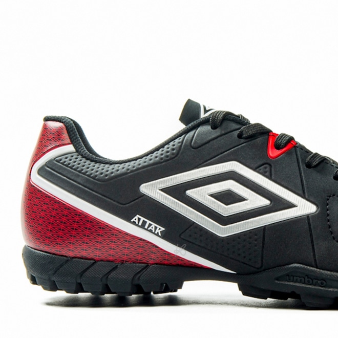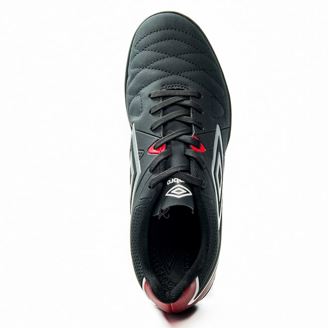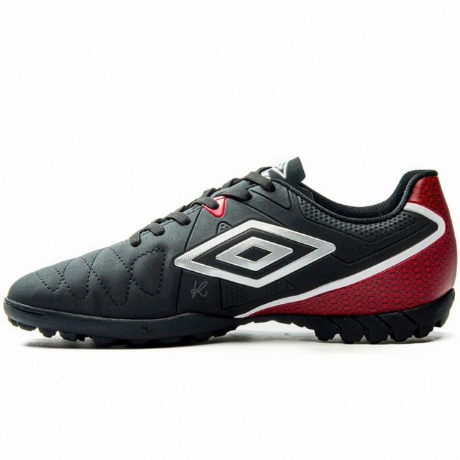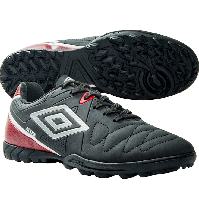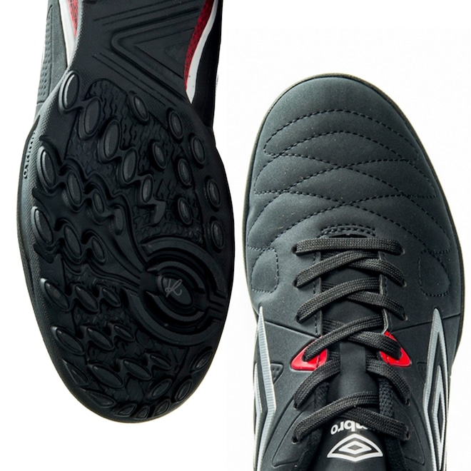 Solado: Borracha com travas baixas para campos de grama artificial.