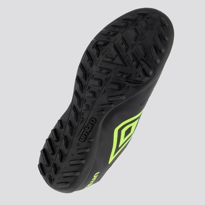 O solado em borracha oferece tração superior nas superfícies de gramado sintético, permitindo mudanças de direção rápidas e movimentos ágeis.