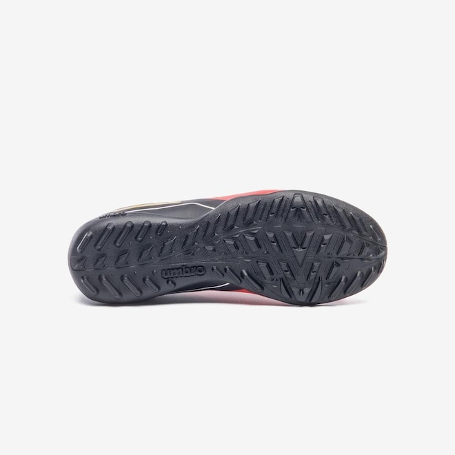 O solado da Chuteira Society Umbro Fifty VI Jr é feito de PVC, com sistema de travas em barra e chevron, ideal para superfícies de grama sintética. Essa configuração proporciona excelente tração e estabilidade, permitindo que você faça movimentos rápidos e precisos em campo.