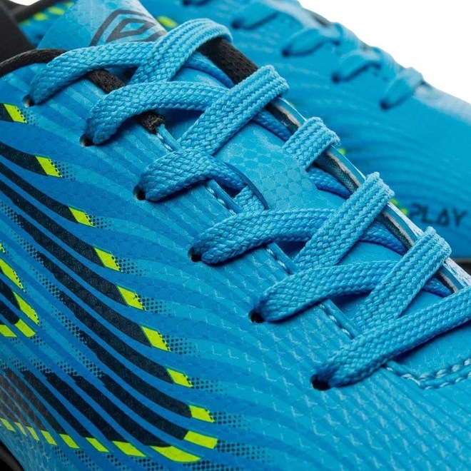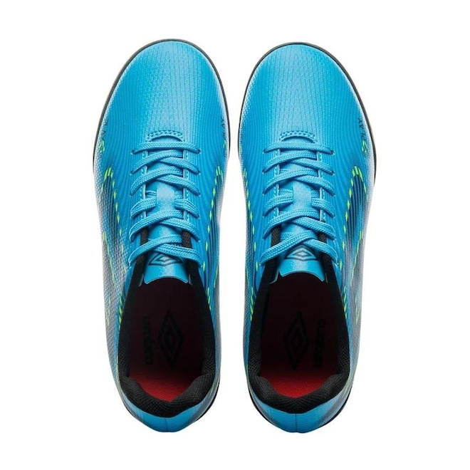 O cabedal (parte superior do calçado) é construído em material sintético laminado e texturizado, com aplicação de grafismos em linhas onduladas que sobrepõem o Diamante Umbro estilizado, proporcionando uma ilusão de profundidade e movimento em toda a lateral da chuteira.