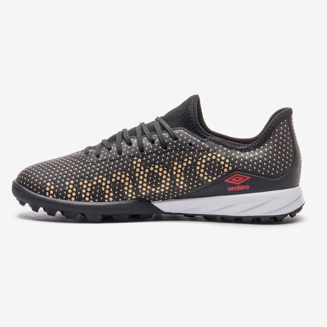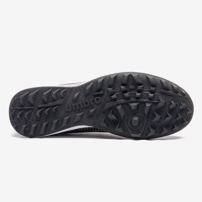 O cabedal da chuteira é confeccionado em material laminado, com alta frequência, proporcionando durabilidade e resistência. A área do peito do pé e a lingueta são revestidas em mesh com elastano, oferecendo um ajuste perfeito. O atacador estilizado e o Diamante Umbro na lateral externa adicionam um toque de sofisticação ao design.