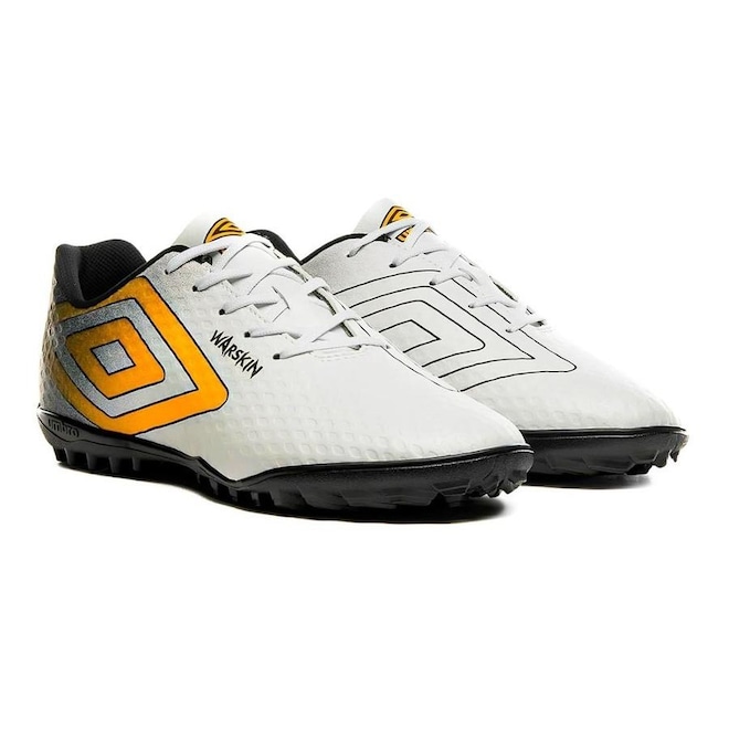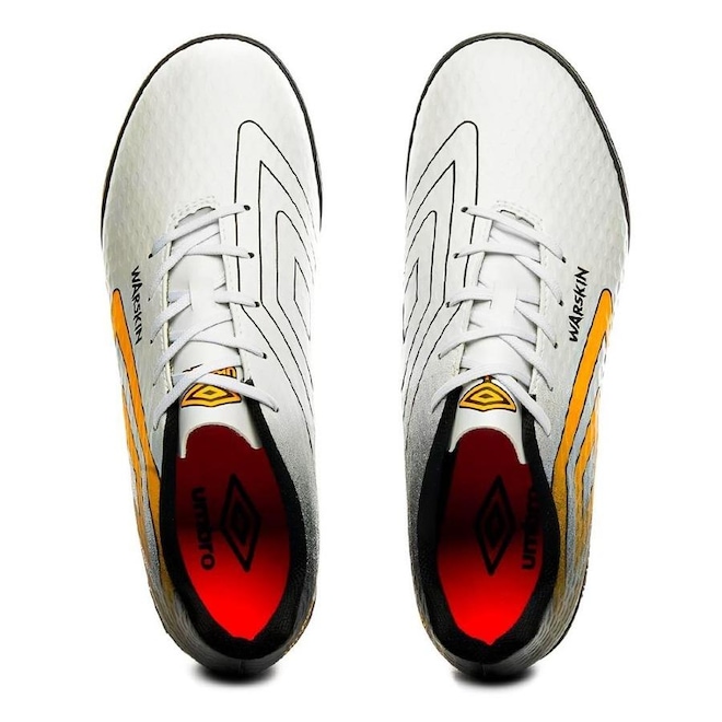 A Chuteira Society Umbro Warskin é ideal para os jogadores que procuram domínio e controle dentro do gramado sintético. Inovador e funcional, o cabedal traz grafismo em degradê e textura integral que utiliza um novo tipo de cilindro para proporcionar um melhor grip no momento do chute. Cabedal assimétrico construído em material laminado com frequência em rolo aplicada em todo a extensão, que oferece um grip superior quando ocorre o contato com a bola. Possui serigrafia em duas cores com efeito degradê, assinatura Warskin aplicada próximo ao atacador, Diamante Umbro em destaque na lateral e palmilha macia em EVA com tecido de poliéster forrado. O solado de futebol society HG é composto por PVC.ref: M11V58