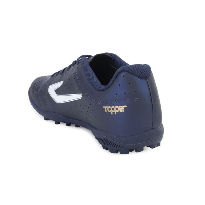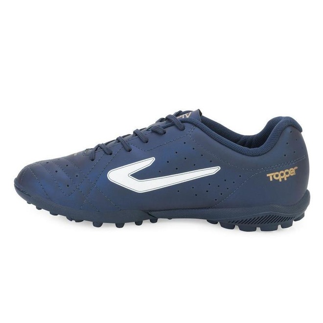Nome: Chuteira Topper Society Top Boleiro V. Gênero: Masculino. Indicado Para: Society. Ocasião: Treino e competição. Material Externo: Alternativo com costuras. Fechamento: Cadarço. Material Interno: Têxtil acolchoado. Palmilha: EVA forrada, removível. Solado: Borracha travas específicas para quadra society. Peso do Produto: 836 g (o peso varia de acordo com a numeração). Garantia do Fabricante: Contra defeito de fabricação. Origem: Nacional. Código Produto: 01230699. Marca: Topper.ref: M127BX