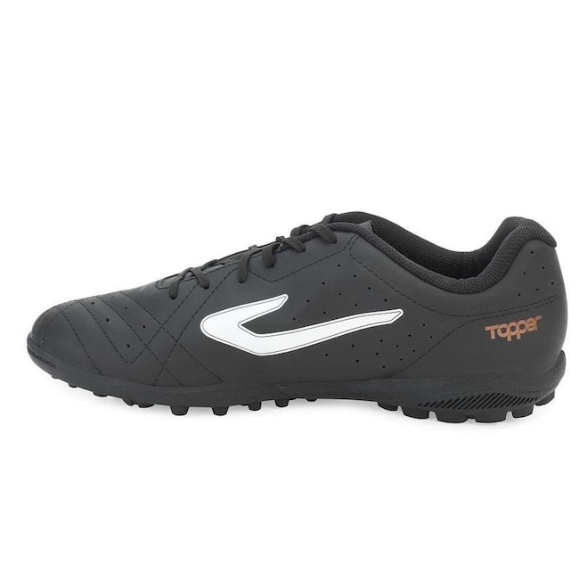 Nome: Chuteira Topper Society Top Boleiro V. Gênero: Masculino. Indicado Para: Society. Ocasião: Treino e competição. Material Externo: Alternativo com costuras. Fechamento: Cadarço. Material Interno: Têxtil acolchoado. Palmilha: EVA forrada, removível. Solado: Borracha travas específicas para quadra society. Peso do Produto: 836 g (o peso varia de acordo com a numeração). Garantia do Fabricante: Contra defeito de fabricação. Origem: Nacional. Código Produto: 01230698. Marca: Topper.ref: M127DH