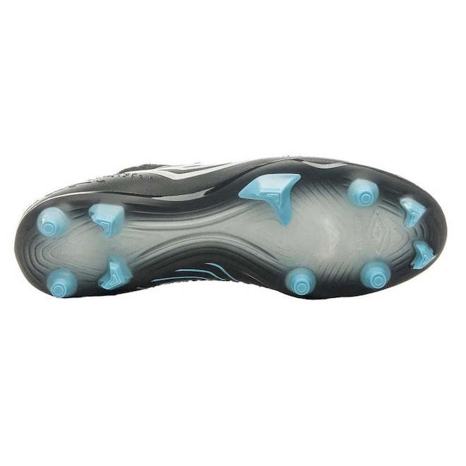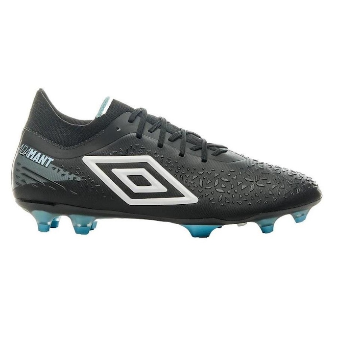Cabedal assimétrico construído em estrutura de knit ultraleve na lingueta com tecido de reforço fusionado e lâmina de TPU ultrafina de 0,35 mm. A parte frontal e o talão são em couro tipo Napa Premier com costuras de reforço e linhas de flexão em pontos de maior contato com a bola. Possui fechamento em combinação de meia de knit compressiva com cadarço para um ajuste mais seguro e confortável, forro em microfibra luvada, Diamante Umbro com efeito metalizado na lateral, assinaturas do modelo na parte posterior, na palmilha e no solado. A palmilha interna é anatômica e em EVA conformado de dupla densidade com tecido forrado. O solado de campo FG de 11 travas mistas com ponteiras em TPU, é produzido em Pebax translúcido na base com estrutura interna de palmilha de montagem injetada também em Pebax, que oferece retorno de energia e reforço na área do enfranque.