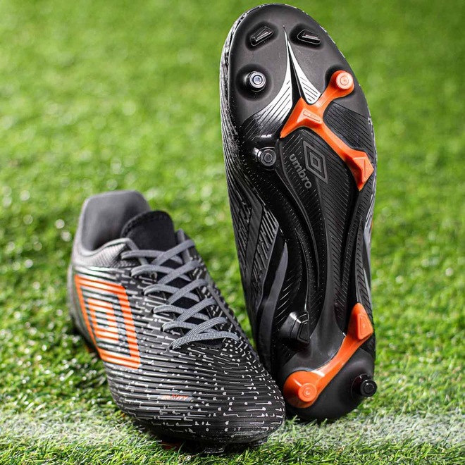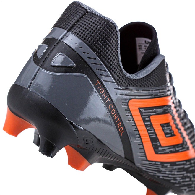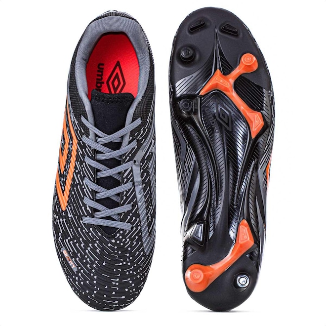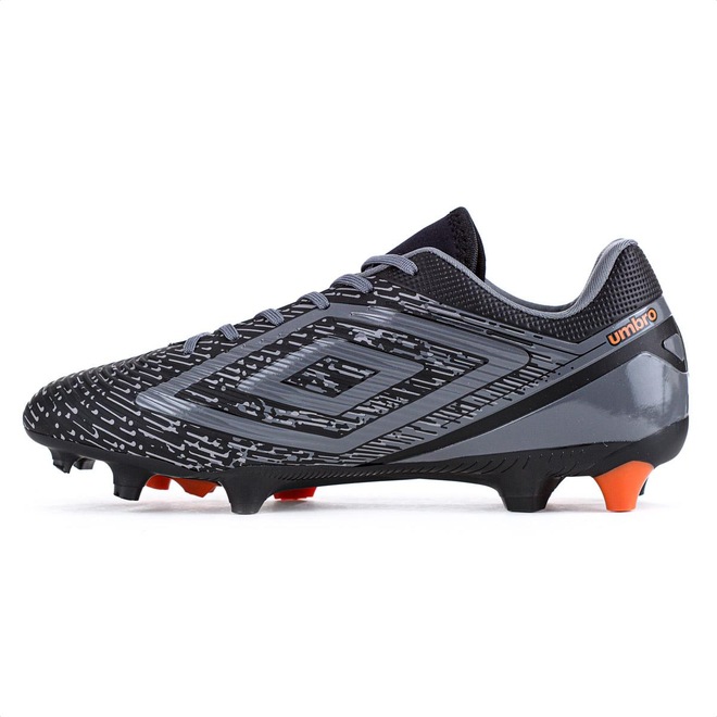 Chuteira Umbro Campo Gravity Preto Grafite e Laranja - Masculino. Design moderno e funcional para o jogador! Ficha Técnica: Cor: Preto, Grafite e Laranja  Material: Laminado sintético  Detalhes: Lingueta tipo ?morcego? Palmilha: EVA forrado  Sola: TPU com travas altas  Cabedal: 100% sintético Gênero: Masculino  Marca: Umbro    Conteúdo da embalagem: 1 par de Chuteira Umbro Campo Gravity Preto Grafite e Laranja - Masculino    A Chuteira Umbro Campo Gravity Preto Grafite e Laranja é perfeita para jogadores iniciantes e intermediários que buscam conforto e estilo. Com um design moderno e texturizado no cabedal, ela melhora o grip e o domínio da bola. Sua lingueta em formato ?morcego? proporciona um ajuste seguro, enquanto o solado Stealth FG, feito de TPU, oferece tração e durabilidade, permitindo que você jogue com confiança.