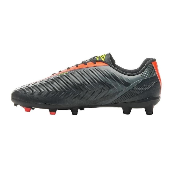 A chuteira Fifty IV é 50% Estilo, 50% Performance e 100% Umbro. Com ela, você poderá mostrar suas habilidades em campo e mudar o jogo. O cabedal é assimétrico, construído em material laminado com brilho metalizado. Possui uma cor do lado externo e outra do lado interno combinado com uma tira de acabamento em cor diferenciada, além de aplique de alta-frequência para melhorar o efeito do chute em contato com a bola. Solado de campo FG de 10 travas +2 travas centrais de tração em material TPU com travas bicolores posicionadas.
