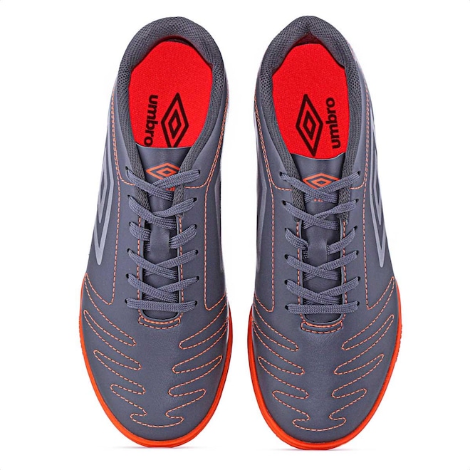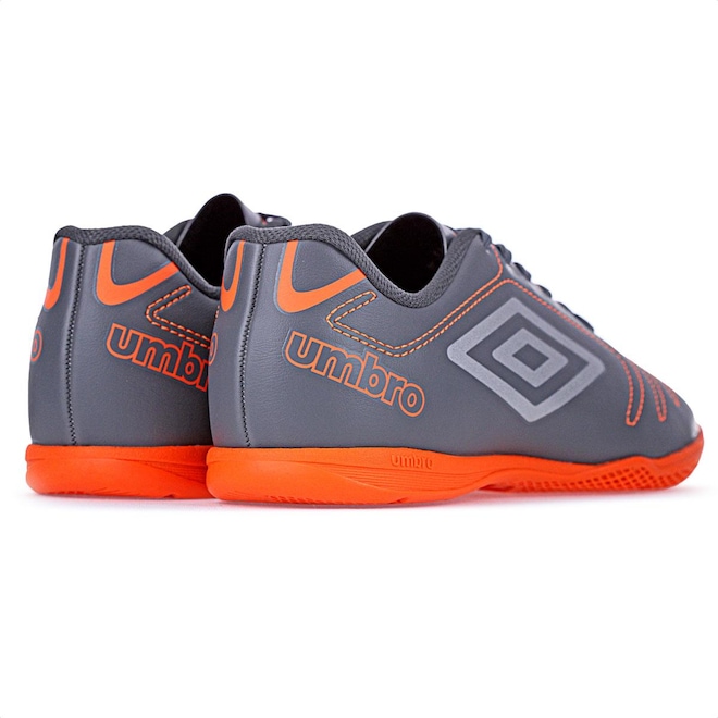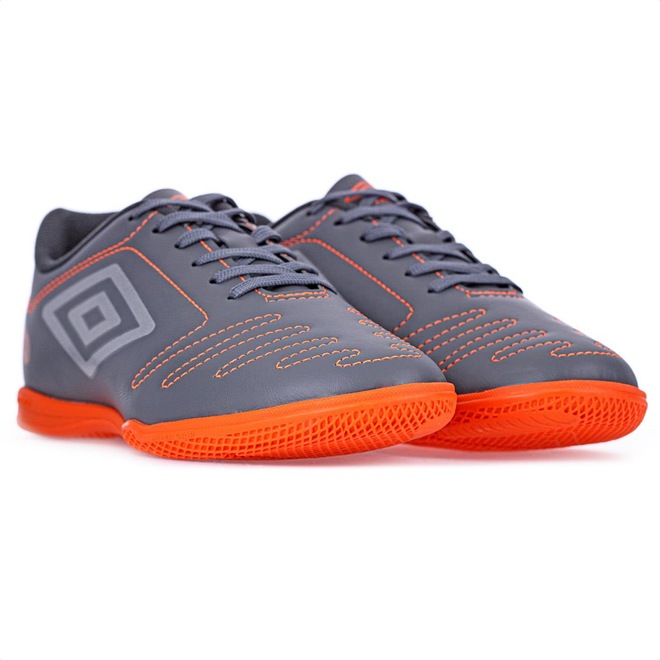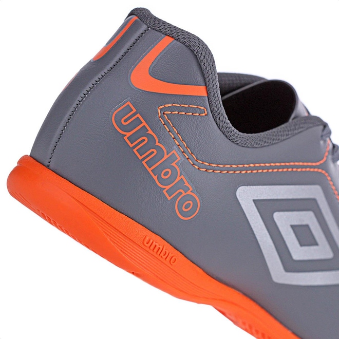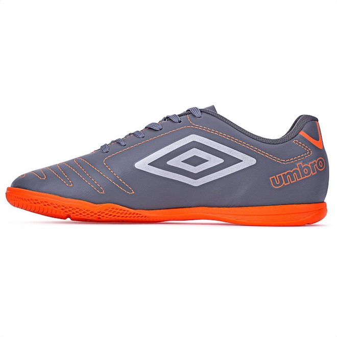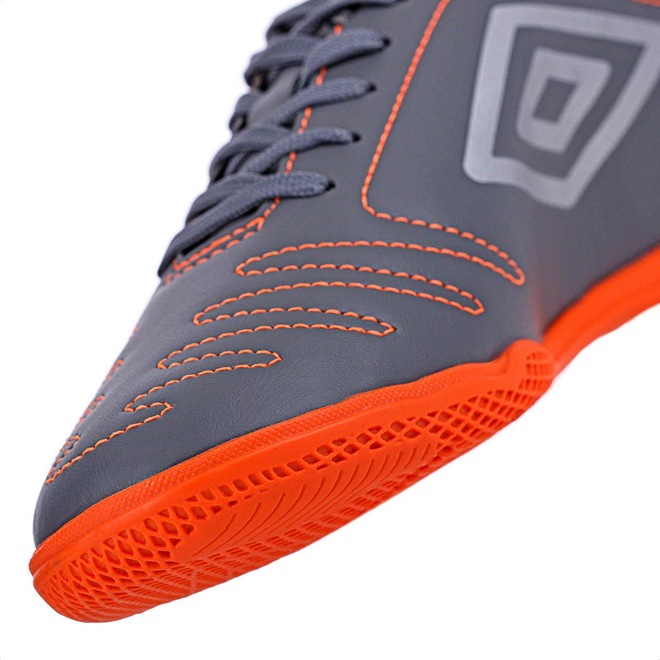 Chuteira Umbro Futsal Class Cinza e Laranja - Masculina Jogue com classe, vença os adversários. A chuteira de futsal Umbro Class eleva seu jogo. Seu cabedal, construído em material sintético, possui costuras programadas para maior reforço e auxílio na flexão do material. Ele garante velocidade e ótimas passadas em quadra. O solado em borracha mantém o pé firme durante as corridas e dribles desconcertantes, proporcionando maior aderência ao solo. Ficha Técnica: Marca: Umbro Composição do cabedal: 100% sintético Forro: 100% poliéster Palmilha: 90% EVA, 10% poliéster Solado: 100% borracha antiderrapante Benefícios: Ventilação aos pés, respirabilidade, conforto, solado emborrachado, aderência ao solo Cor: Cinza e Laranja Indicação: Futsal Gênero: Masculino Conteúdo da embalagem: 1 par de Chuteira Umbro Futsal Class Cinza e Laranja - Masculinaref: M15GP5