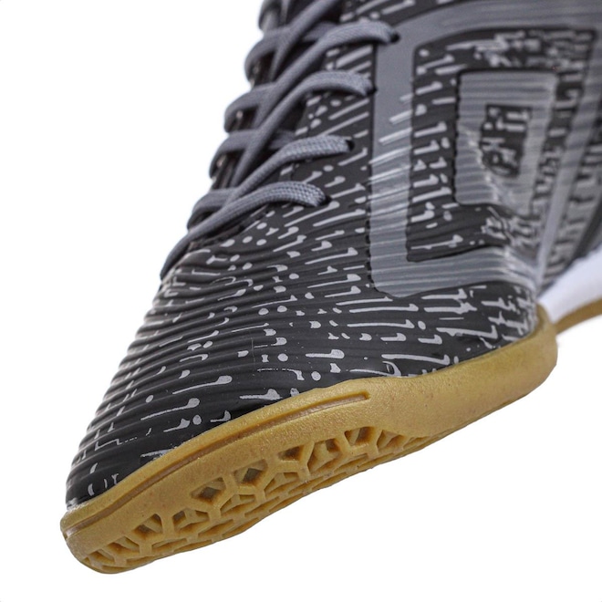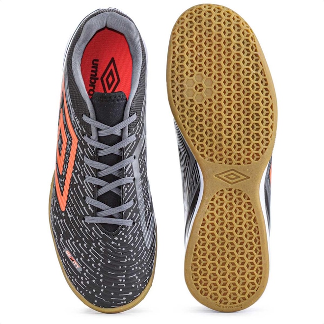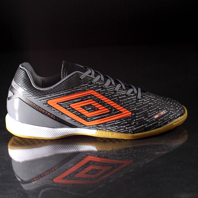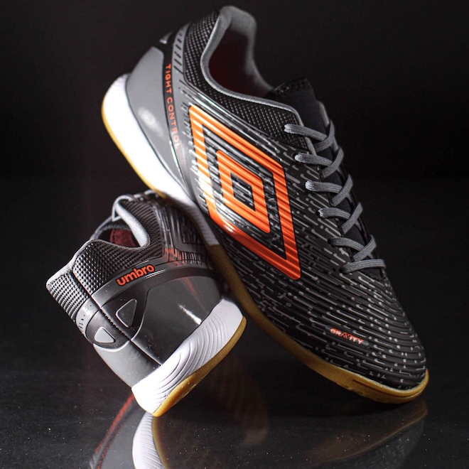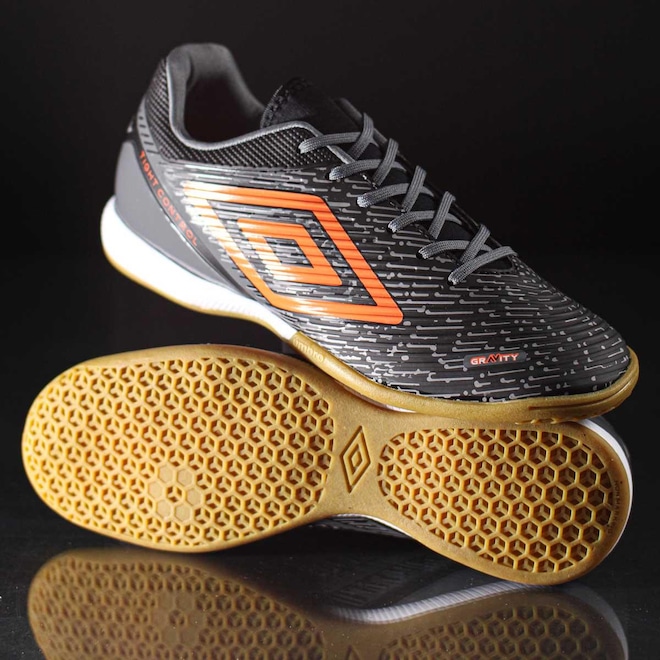 Chuteira Umbro Futsal Gravity Preto Grafite e Laranja ? Masculino. Conquiste cada jogada com estilo e precisão! Ficha Técnica: Indicação: Futsal Cabedal: 100% Sintético com texturas em alta frequência Forro: 100% Poliéster Palmilha: 90% EVA e 10% Poliéster Sola: 70% Borracha e 30% EVA injetado Cor: Preto, grafite e laranja Gênero: Masculino Marca: Umbro Conteúdo da Embalagem: 1 par de Chuteira Umbro Futsal Gravity Preto Grafite e Laranja - Masculino A Chuteira Umbro Futsal Gravity é ideal para jogadores que buscam aprimorar suas habilidades em quadra. Com um cabedal texturizado que melhora o controle da bola e uma lingueta tipo "morcego" que oferece ajuste firme, esta chuteira é sinônimo de conforto e segurança. O solado de borracha antiderrapante garante aderência e durabilidade, enquanto a entressola em EVA injetado proporciona um amortecimento eficiente para os movimentos rápidos.ref: M164L8