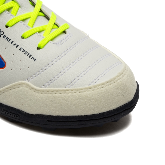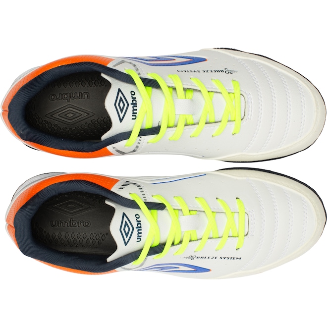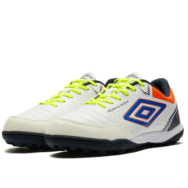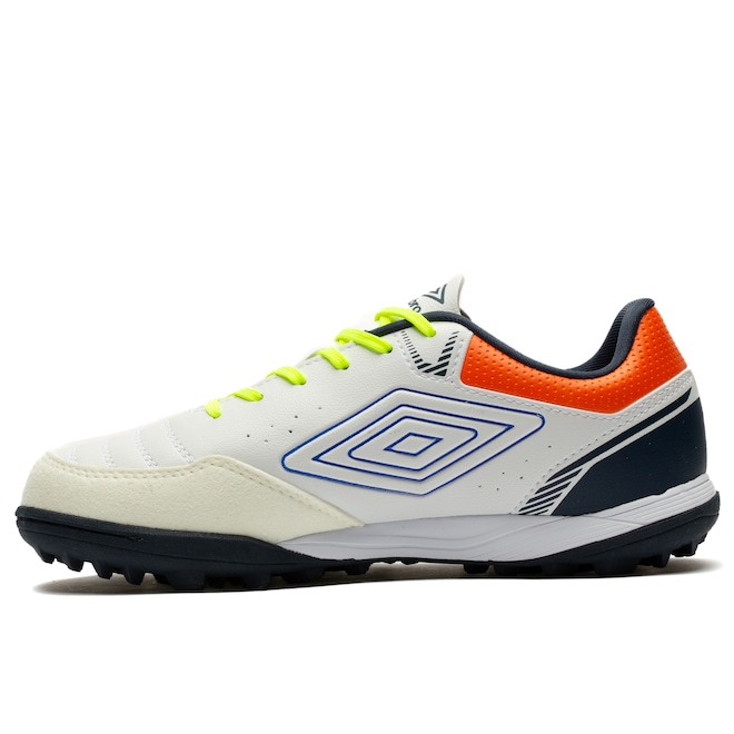 Reforço acolchoado- Material da Trava - Borracha - Tamanho da Trava - Baixa - Tipo de Trava - Fixa - Estampa do Logo - Estampado no Cabedal - Faixa Etária - Adulto - Garantia do Fornecedor - Contra Defeito de Fabricação - Conteúdo da Embalagem - 1 Par - SAC do Fornecedor - Umbro: (11) 2394 - 9702 - Tecnologia(s) no Solado - 360° Zone: Ponto de giro que permite a rápida mudança de direção. - Nível - Iniciante