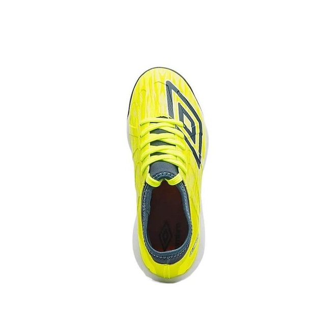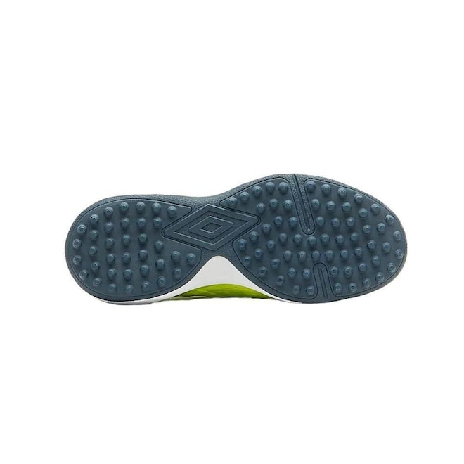 Cabedal assimétrico construído em material laminado emborrachado liso, com toque macio, e detalhes em janelas de alta frequência. Possui calce tipo meia em tecido com elastano e acabamento em debrum, grafismo camuflado geométrico em serigrafia, maxi Diamante Umbro aplicado na região frontal, assinatura do modelo na lateral externa da parte posterior e palmilha interna em EVA forrado. O solado de society é composto por TPU monocolor com sistema de travas cônicas e entressola em EVA para maior conforto.