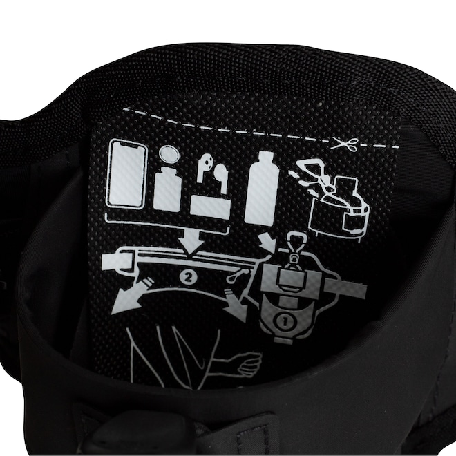 Já o compartimento externo possui bolso e cinto regulável por fivela proporcionando um ajuste personalizado.