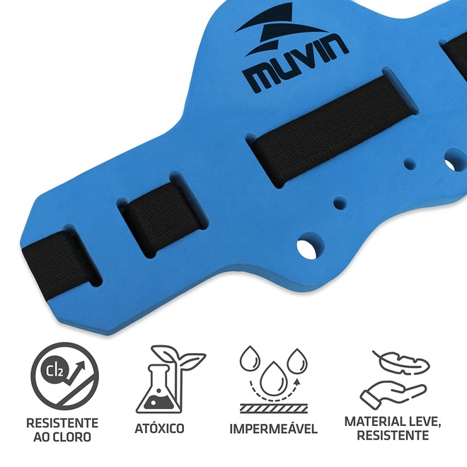 O Cinto de Flutuação da Muvin é desenvolvido em EVA, projetado para ter um ajuste confortável por conta do material e também funcional. O fechamento é feito por fecho de contato para que você possa posicionar e ajustar da melhor maneira. O EVA, material no qual é desenvolvido o Cinto de Flutuação, é leve, flexível, atóxico e também lavável. Por conta dessas características, o cinto torna-se um produto resistente e também de longa duração.