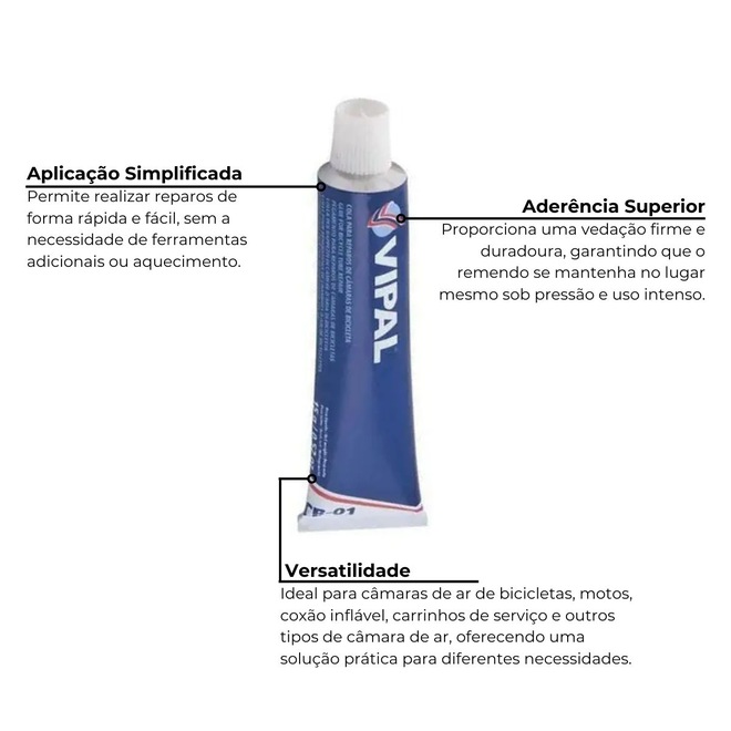 A Cola VIPAL a Frio é a solução perfeita para reparos rápidos e eficientes em câmaras de ar, bicicletas, motos e carrinhos de serviço. Permite realizar remendos sem a necessidade de calor. Sua fórmula avançada garante uma aderência forte e duradoura, facilitando a manutenção e prolongando a vida útil dos seus pneus.