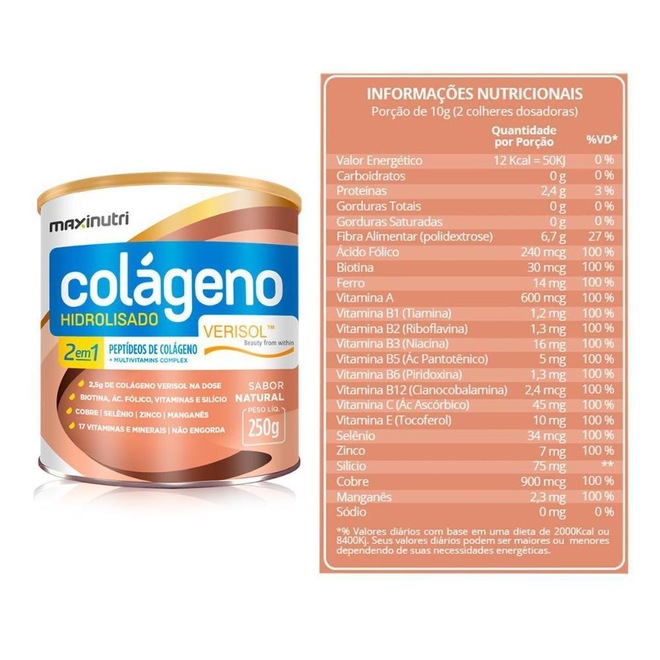 Isso se deve a sua incrível e exclusiva formulação 2 em 1, resultado de combinação de 2,5g de Colágeno Verisol e mais um complexo de 17 Vitaminas, Minerais e Silício Orgânico e ação Hair Skin & Nails (especifico para fortalecer suas unhas e cabelos).
