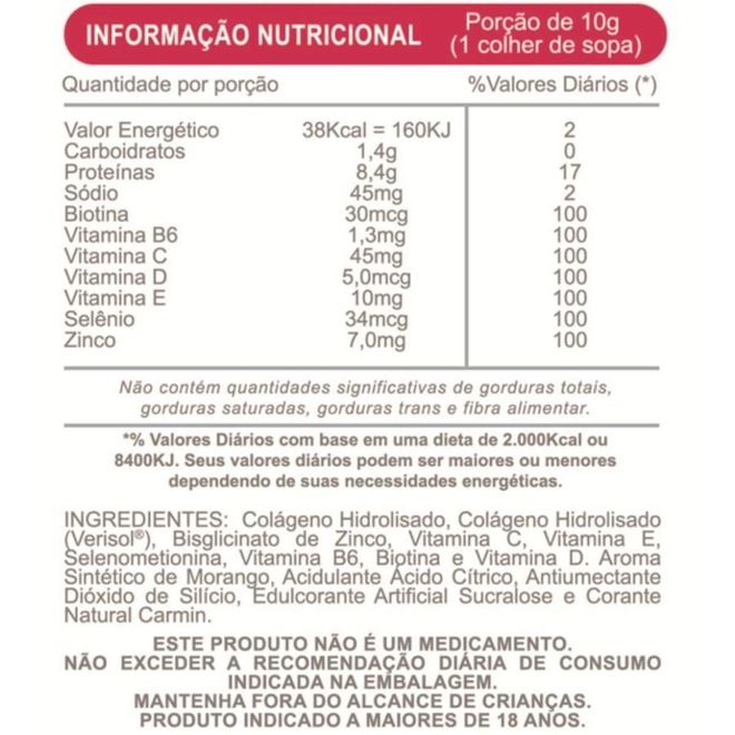 Colágeno Hidrolisado, Colágeno Hidrolisado (Verisol®), Bisglicinato de Zinco, Vitamina C, Vitamina E, Selenometionina, Vitamina B6, Biotina e Vitamina D.Aroma Sintético de Morango, Acidulante Ácido Cítrico, Antiumectante Dióxido de Silício, Edulcorante Artificial Sucralose e Corante Natural Carmin.