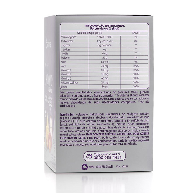 O Colágeno hidrolisado da Sanavita com Verisol® possui fórmula exclusiva e diferenciada, devido à associação de peptídeos bioativos de colágeno com 100% das necessidades diárias das vitaminas A, C, E , ácido pantotênico, biotina e zinco, que potencializam a nutrição de dentro para fora.