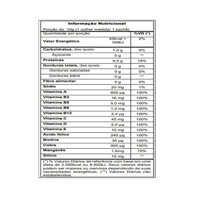 Benefícios: a vitamina A auxilia na visão as vitaminas A, B6, B12, C, D, ácido fólico e o cobre auxiliam no funcionamento do sistema imune as vitaminas A e B3 contribuem para a manutenção da pele e a biotina e o cobre contribuem para a manutenção do cabelo e da pele as vitaminas B3, B5, B6, B12, C, biotina, o cobre e o manganês auxiliam no metabolismo energético a vitamina C auxilia na formação do colágeno o manganês auxilia na formação de ossos e a vitamina D na formação de ossos e dentes a vitamina D auxilia no funcionamento muscular o ácido fólico auxilia na síntese de aminoácidos o cobre auxilia na manutenção dos tecidos conjuntivos e o manganês na manutenção dos tecidos conectivos.