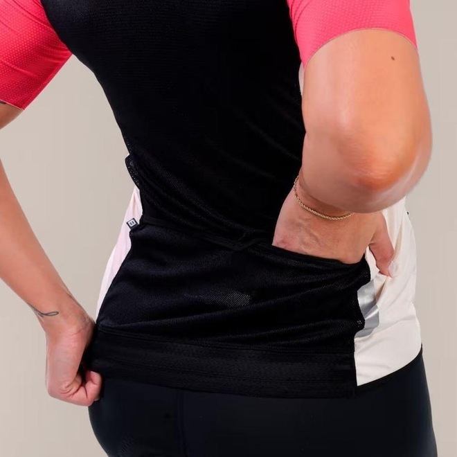 Destacam-se as áreas de acesso nas costas, permitindo a inserção ou remoção de objetos no bolso da camisa sem retirar o colete. O bolso frontal com zíper invisível é ideal para itens durante o pedal, e sua praticidade é reforçada pela compactibilidade, podendo ser transportado no bolso da camisa de ciclismo. A tarja refletiva aumenta a segurança em pedais noturnos, enquanto o elástico com filamentos de silicone na barra traseira mantém o colete no lugar, resistindo à interferência do vento.