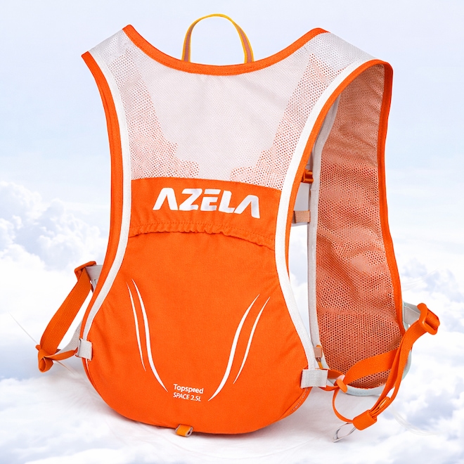 2.【Design ultraleve】O material de náilon de alta qualidade e o design ultraleve tornam a condução mais confortável. A mochila esportiva pesa apenas 180 gramas. Além disso, os cintos esquerdo e direito possuem bolsos para guardar garrafas PET de 250 ml.