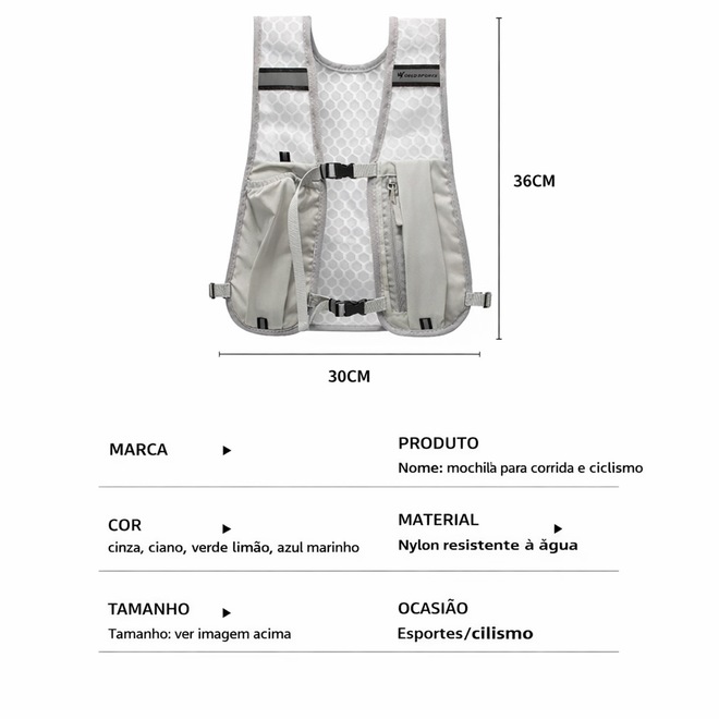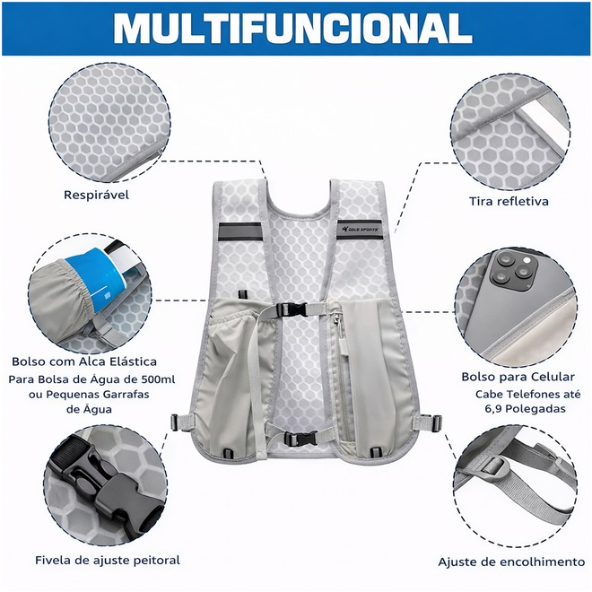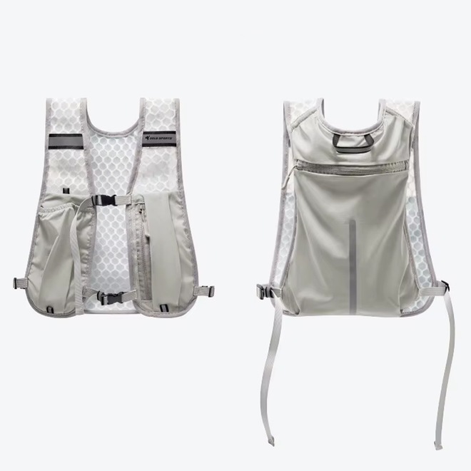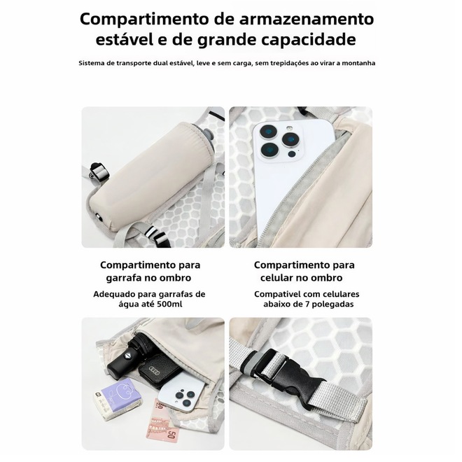 1. Este colete esportivo possui uma manga de hidratação estruturada em 3D à direita para armazenamento seguro e anti-balanço da garrafa de água e um bolso de telefone à prova d'água e de fácil acesso à esquerda, garantindo a conveniência das mãos livres.