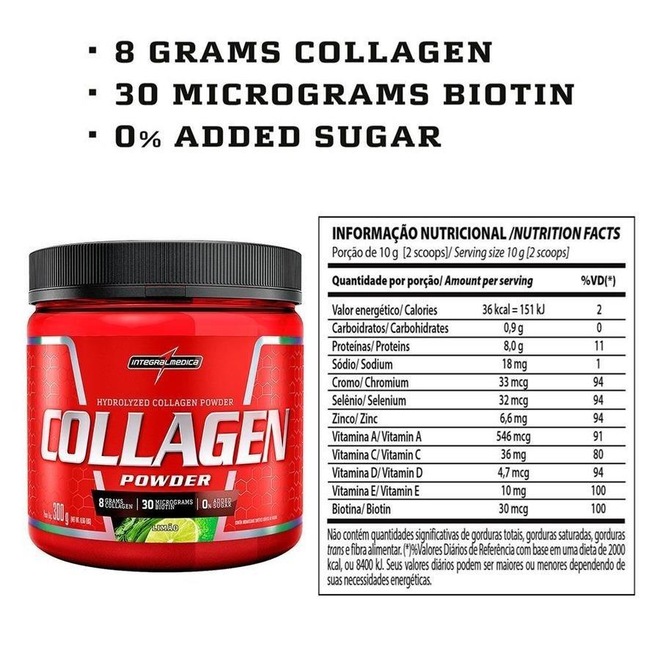 Sem adição de açúcares, lactose, glúten, corantes ou adoçantes artificiais, collagen powder é composto somente por nutrientes favoráveis à saúde e beleza da pele.