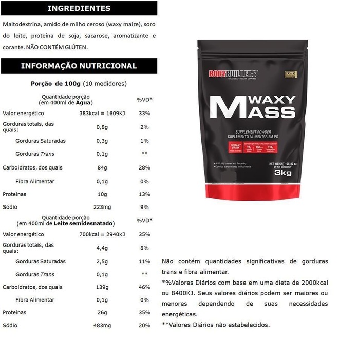 Composição do Anúncio: 3x HIPERCALÓRICO WAXY MASS: Refil com 3kg HIPERCALÓRICO WAXY MASS é indicado para pessoas que têm o metabolismo muito acelerado e querem ganhar peso desenvolvendo massa magra. HIPERCALÓRICO WAXY MASS foi desenvolvido com os melhores carboidratos de rápida absorção em conjunto com as proteínas do soro do leite e da soja, fornecendo a cada dose se consumido com leite semidesnatado 727kcal e 26g de proteínas. SUGESTÃO DE CONSUMO: a) HIPERCALÓRICO Adicionar 160g (8 colheres de sopa cheia) em 250ml (1 ¹/4 copo) de leite semidesnatado. Ingerir 2 porções diárias ou conforme orientação de médico e/ou nutricionista. IMPORTANTE: a) Validade dos produtos: de 18 a 24 meses b) Vendemos somente produtos originais e devidamente lacradosref: M039OL