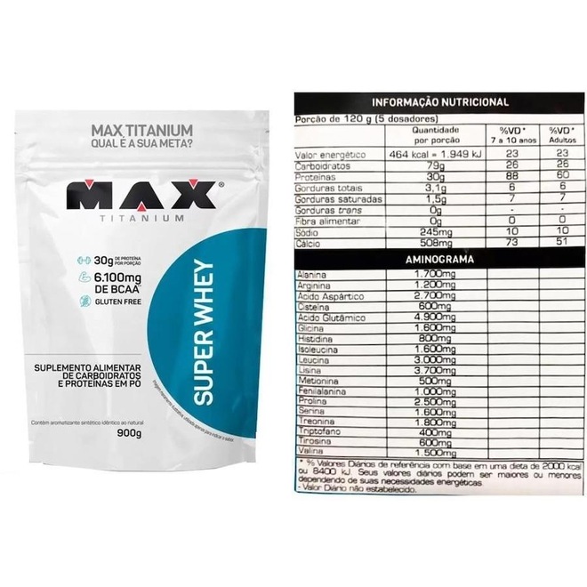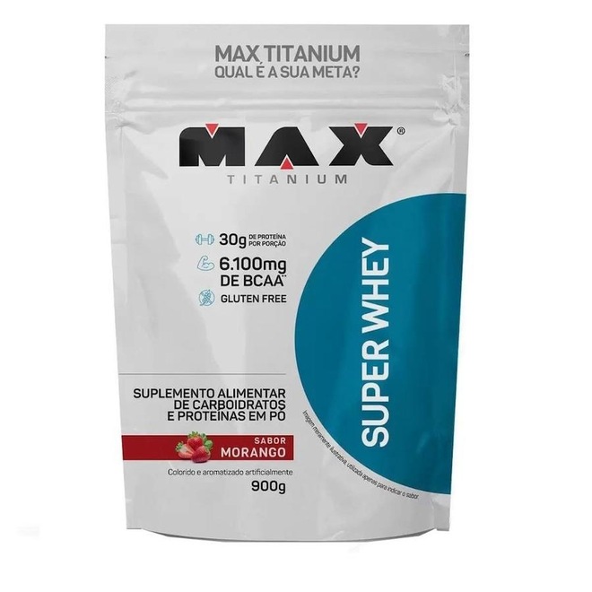 Super Whey da Max Titanium é um suplemento alimentar de carboidratos e proteínas, inovador pois fornece 30g de proteínas por porção.