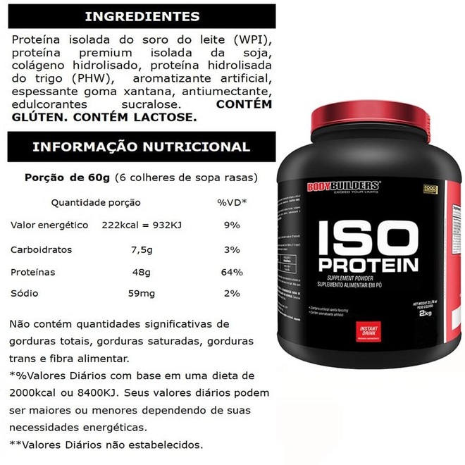 a) Iso Protein: Misture aproximadamente 60g ( 6 colheres de sopa rasa) em 350ml (1 3/4 copo ) de água gelada e agite por 20 segundos. Consumir imediatamente após o preparo.