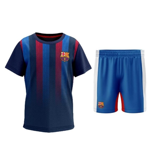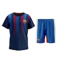 O kit perfeito para o pequeno torcedor do Barcelona. O kit conta com uma camisa do Barça azul escuro com listras verticais em grená e azul em tom mais claro, em tecido 100% poliéster, com o símbolo do Barcelona estampado no peito e um shorts azul no mesmo tom das listras da camisa, também em tecido 100% poliéster e símbolo estampado.