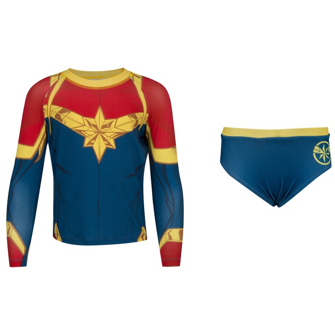 Conheça o Conjunto Camiseta Manga Longa com Proteção Solar UV e Calcinha Capitã Marvel Feminino – Infantil!