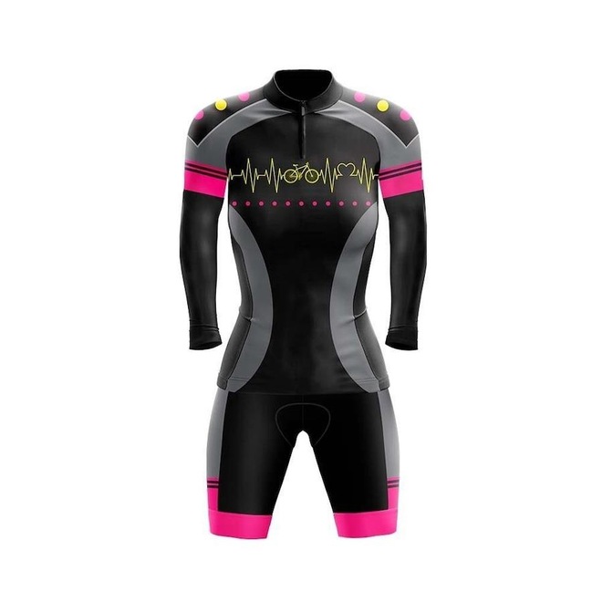 A camisa do conjunto de ciclismo possui zíper de 18cm na frente, oferecendo mais praticidade ao vestir e elástico na parte de baixo para melhor ajuste ao corpo.