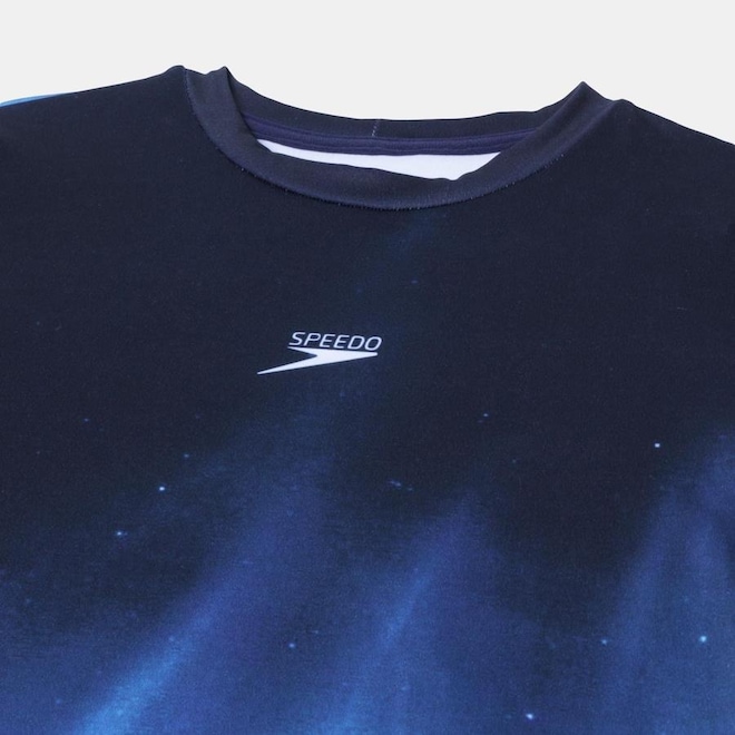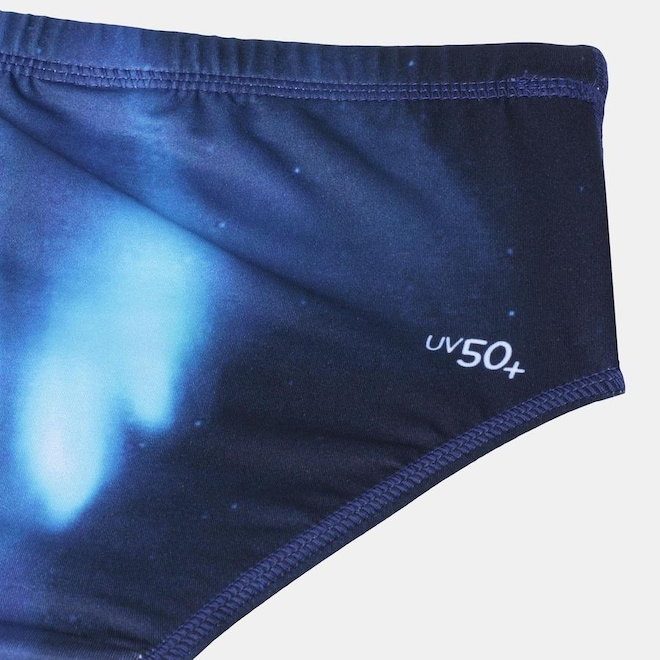 O Conjunto Trunk White Horse SPEEDO da Linha KidSplash é uma leitura da aurora boreal e faz referência à cidade canadense onde o fenômeno pode ser observado ? estampa também disponível para adultos na Linha Colors. É composto por camiseta de manga longa e sunga com forro, ambas as peças com proteção UV.