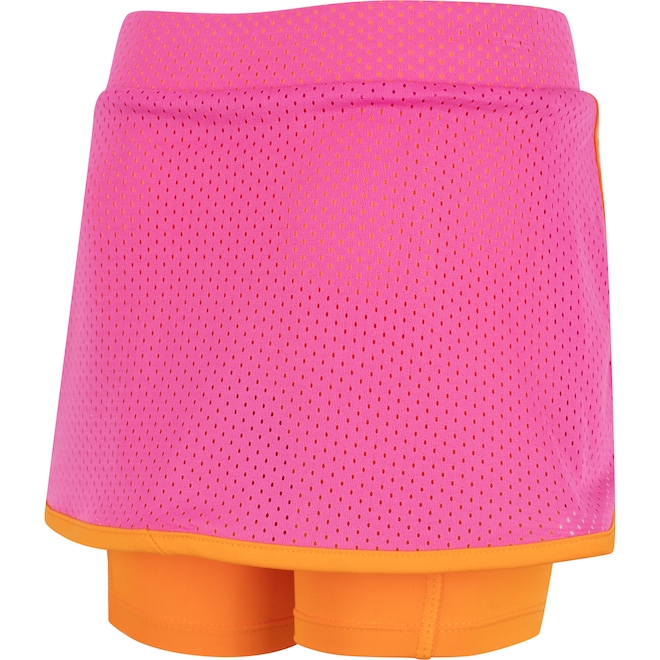 A camiseta de manga curta possui gola careca canelada com tira interna, enquanto o short-saia com cós elástico garante ajuste perfeito. Composto por poliéster, algodão e elastano, assegura durabilidade e toque suave.