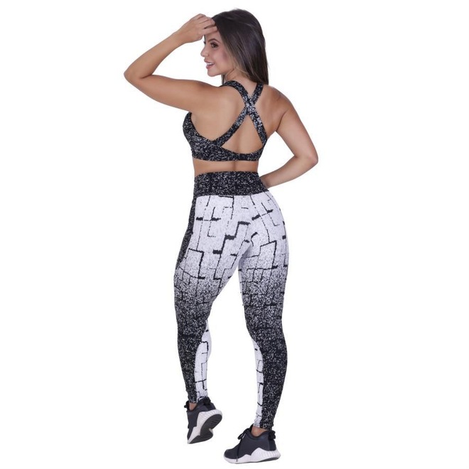 Jacquard degrade Poliamida com elastano, se adapta ao corpo, oferece conforto e segurança na hora da pratica de atividade física, não deixando nenhum tipo de transparência.
