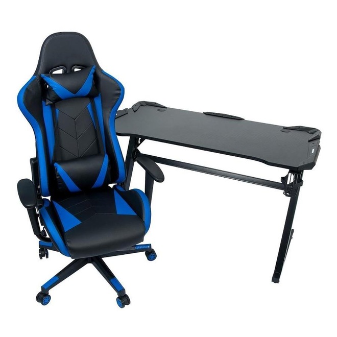 A Mesa Gamer LED Pelegrin PEL-004P tem estrutura metálica branca e tampo em MDF com revestimento preto e acabamentos com LED, que combina perfeitamente com a Cadeira Gamer Pelegrin PEL-3019 Azul, que é revestida em couro PU preto com detalhes em azul, encosto reclinável e almofadas de apoio para o pescoço e para a lombar proporcionando muito mais conforto e garantindo uma ótima postura.Principais Características da Cadeira: