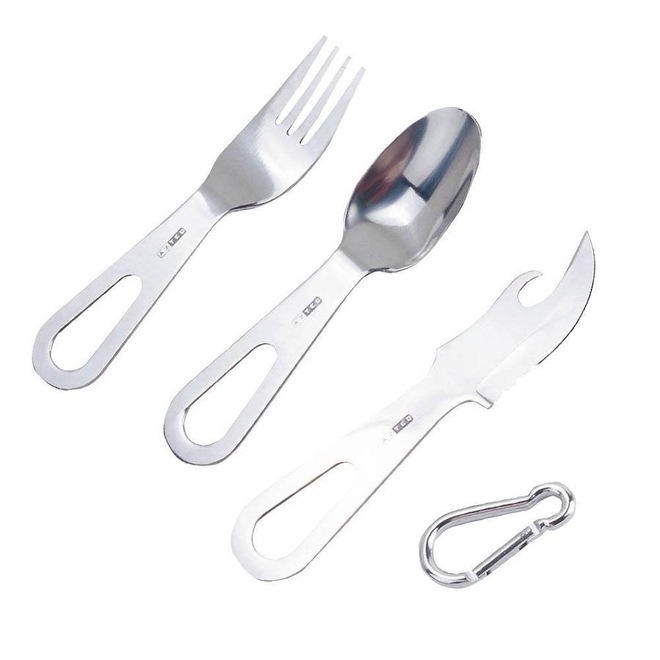 Além disso tudo, todos os talheres têm a traseira aberta para que possam ser agrupados pelo mini mosquetão incluso no kit, fazendo assim com que as peças não se percam quando não estiverem sendo usadas.