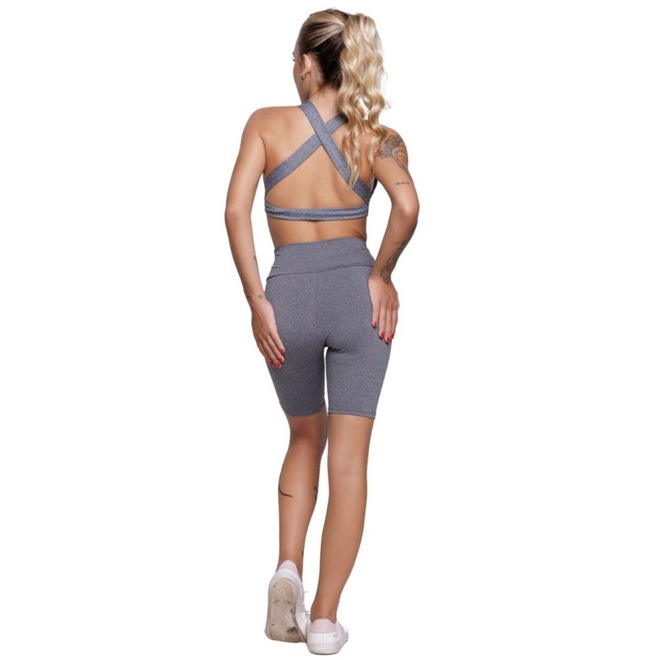 Confeccionado em suplex, esse conjunto possui top com bojo, decote em V e detalhe cruzado nas costas. A bermuda possui cintura média e comprimento na altura dos joelhos. Não possui elástico na cintura, mas sua pala mais grossa permite melhor ajuste ao corpo. . Confortável, ele promove melhor sustentação e segurança para a prática de atividades físicas e é ideal uso diário.