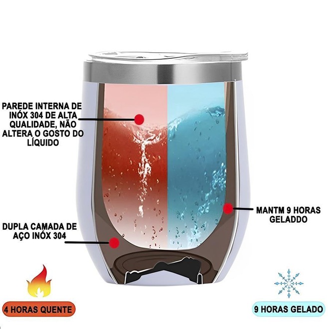 Possui designer elegante, conta com capacidade para 300ml e é feito em aço inoxidável 304. O aço inoxidável 304, ao contrário de outros materiais, possui mais resistência a corrosão, é mais indicado para uso de produtos com finalidade alimentar pois evita a contaminação, não deixa cheiro nem gosto no alimento, além de fácil higienização. Possui tampa com anel de vedação em silicone evitando vazamento pelas laterais, e abertura para canudo. Por ter um tamanho compacto, permite ser levado facilmente na bolsa, ou mochila, para qualquer lugar.Mantém sua bebida quente por aproximadamente 4 horas e gelada por aproximadamente 9 horas.