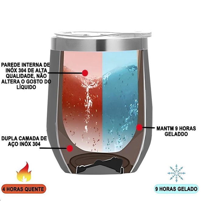 Possui designer elegante, conta com capacidade para 300ml e é feito em aço inoxidável 304. O aço inoxidável 304, ao contrário de outros materiais, possui mais resistência a corrosão, é mais indicado para uso de produtos com finalidade alimentar pois evita a contaminação, não deixa cheiro nem gosto no alimento, além de fácil higienização. Possui tampa com anel de vedação em silicone evitando vazamento pelas laterais, e abertura para canudo. Por ter um tamanho compacto, permite ser levado facilmente na bolsa, ou mochila, para qualquer lugar.Mantém sua bebida quente por aproximadamente 4 horas e gelada por aproximadamente 9 horas.